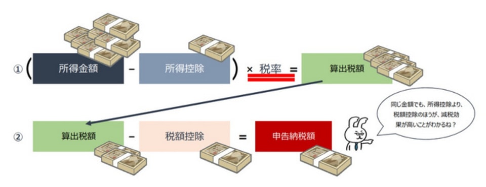 図の通り、同じ「控除」と呼ばれるものでも、「所得」から控除するのか、「税額」から控除するのかによって、減税効果はまったく違います。
