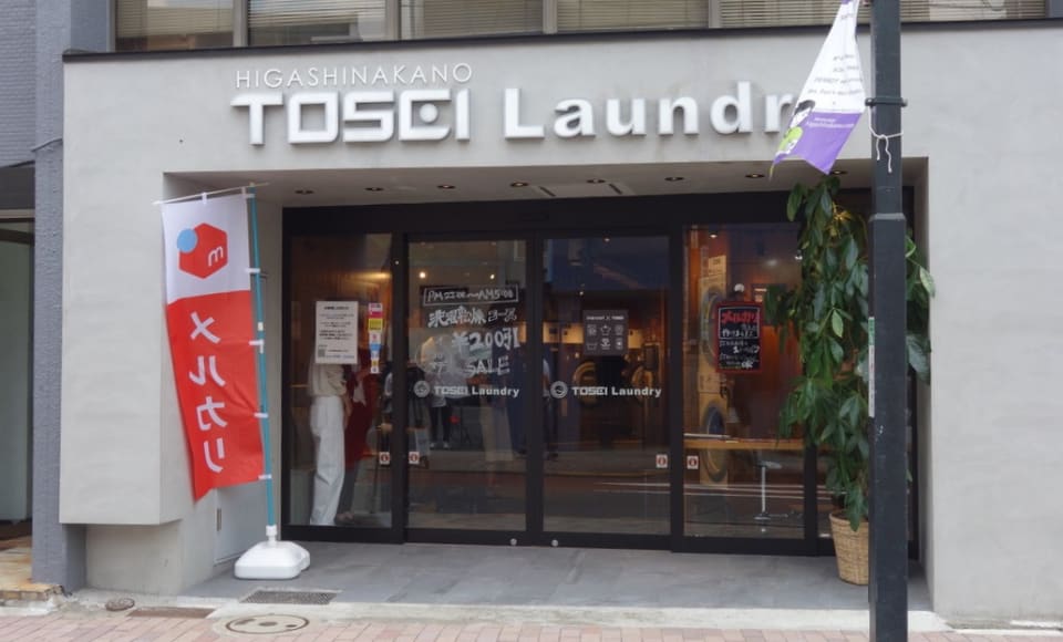 「メルカリ」の幟が立ったコインランドリー ( 1 / 5 )