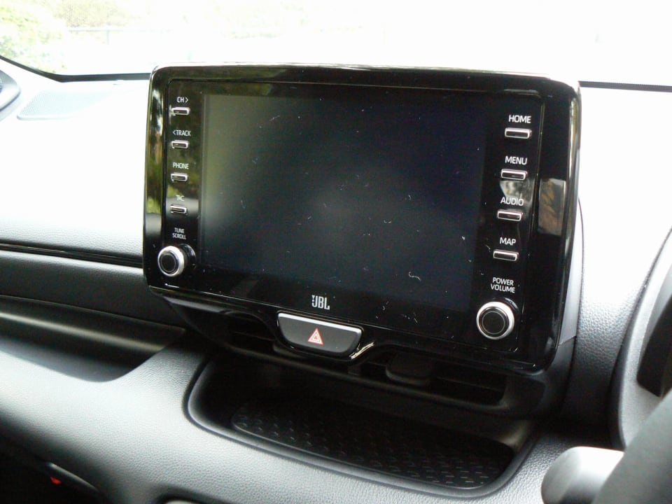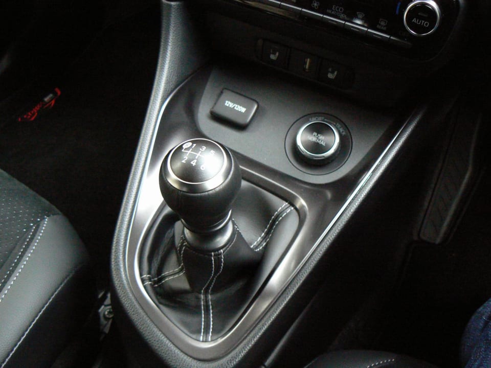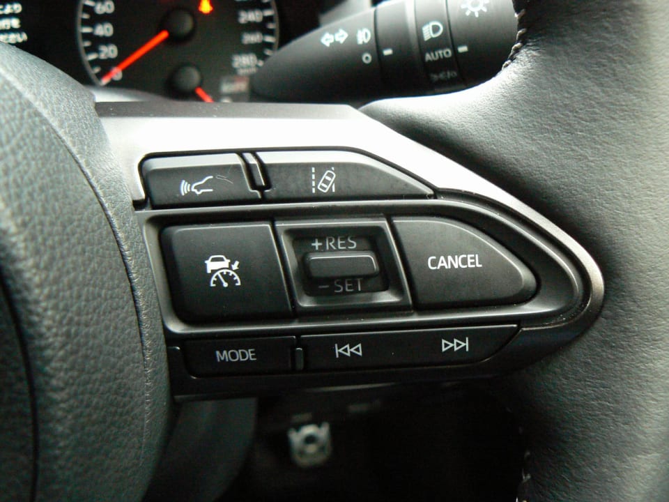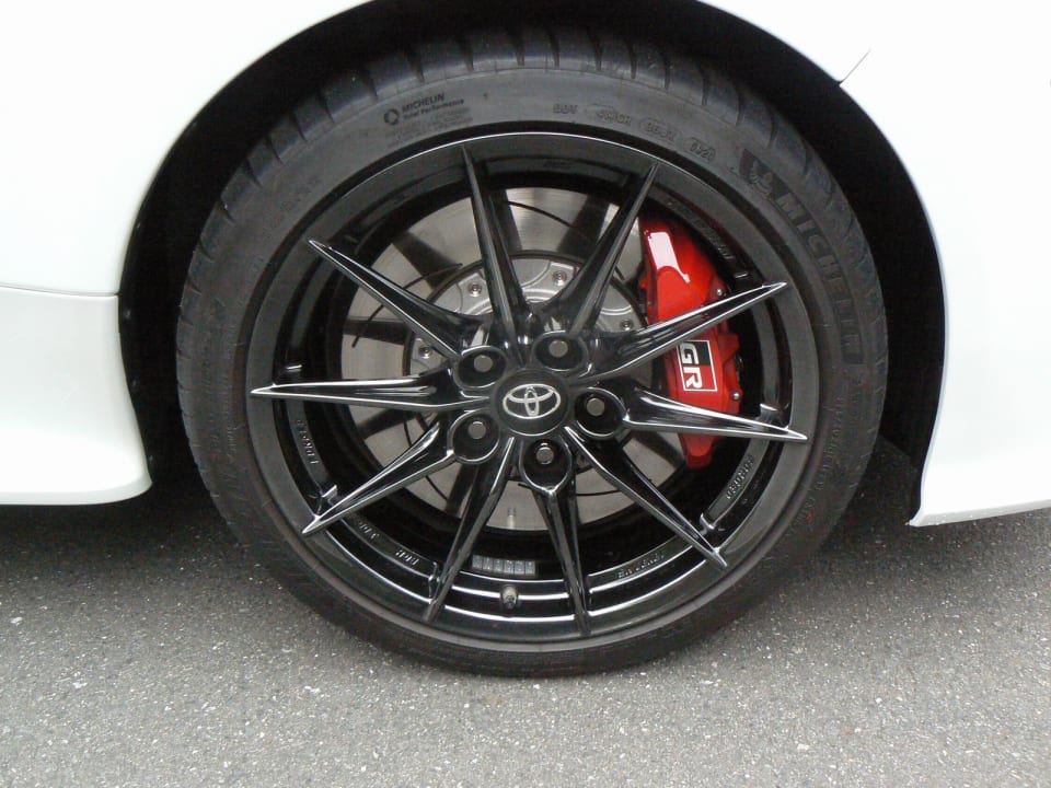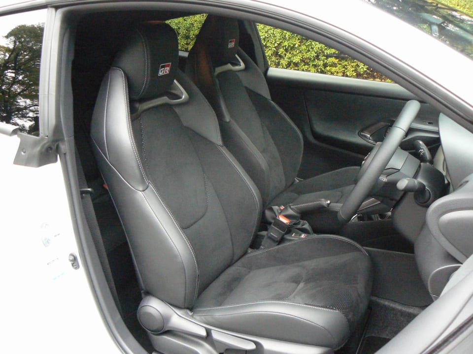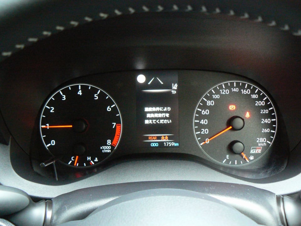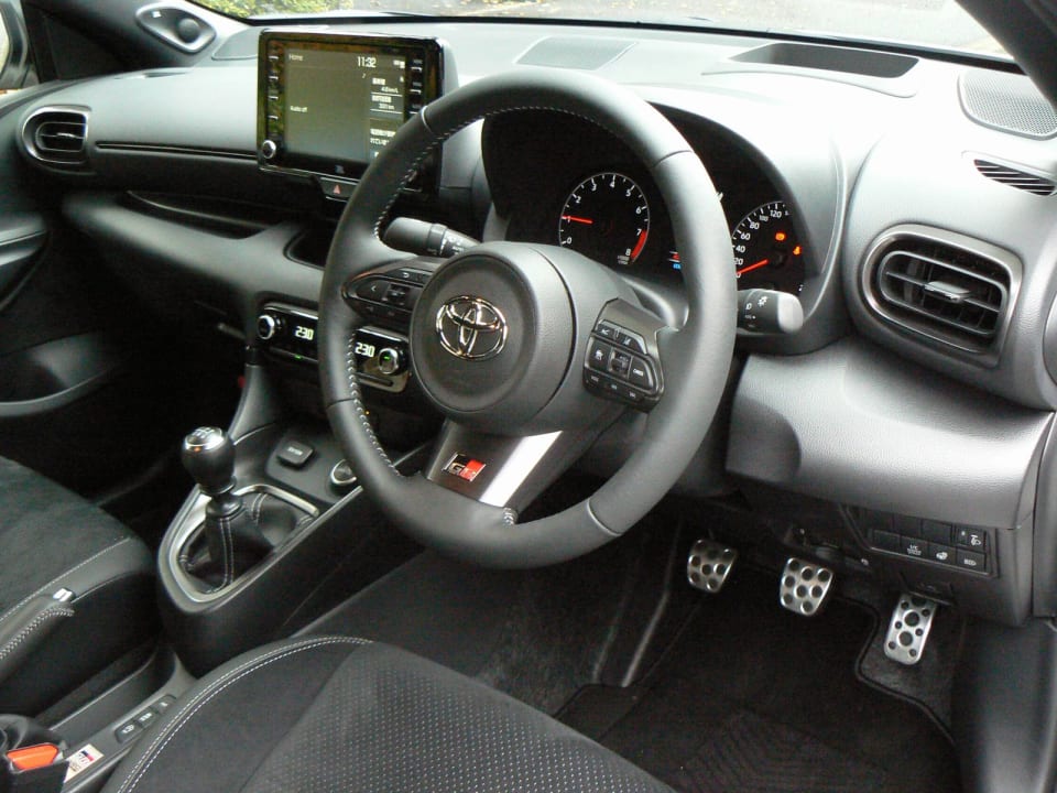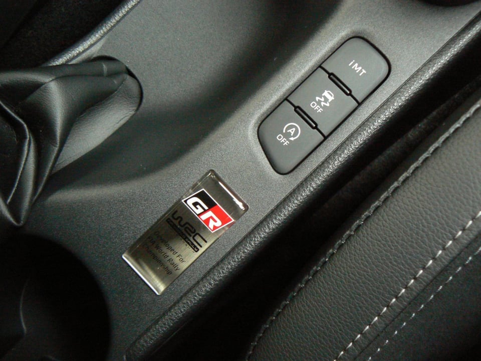 ダッシュボードなどのデザインは基本的にノーマルのヤリスとほぼ同じですが「GR」エンブレム付きの本革巻きステアリングホイールが、その存在感を示します。 ( 11 / 21 )