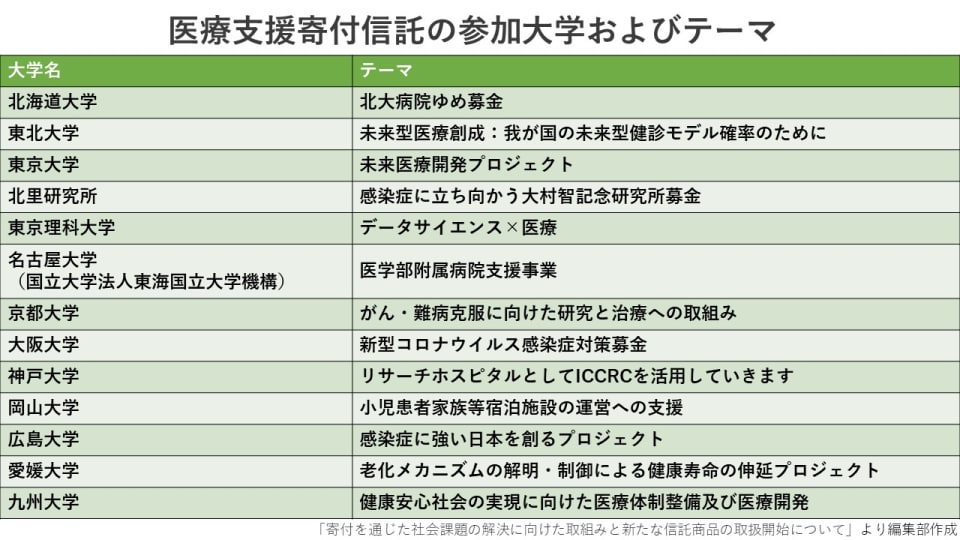 医療支援寄付信託の参加大学およびテーマ ( 1 / 1 )