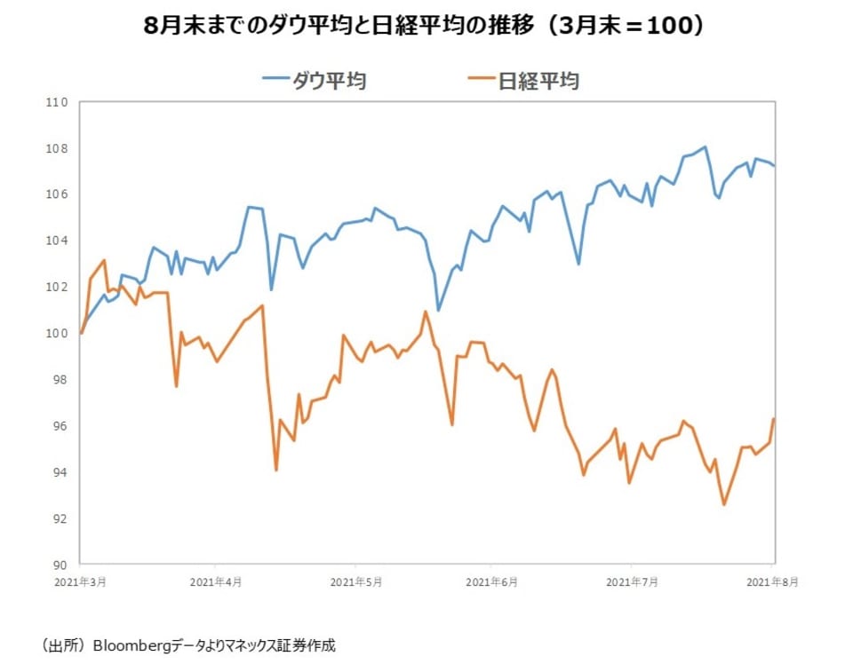 8月末までのダウ平均と日経平均の推移(3月末=100) ( 1 / 3 )