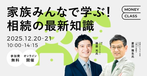 MONEY PLUS>セミナー一覧イベント・セミナー「まずは話を聞いて知識をつけたい」という方に向けて、MONEY PLUS提携ブランドの無料イベントやセミナーを掲載。日銀政策の一手先を読む!2026年を見据えた投資の勝ち筋主催:マネーフォワードホーム株式会社会 場:オンライン開催日時:2025/11/29(土)・30(日) 10:00〜13:00詳細を見る家族みんなで学ぶ!相続の最新知識主催:マネーフォワードホーム株式会社会 場:オンライン開催日時:2025/12/20(土)・21(日) 10:00〜14:15詳細を見る【好きな時間に】ポイントは3つだけ!初心者のための不動産投資セミナー(PR)主催:リズム株式会社会 場:オンライン開催日時:毎日(火曜日・水曜日を除く)11:00~21:00(1時間単位で視聴枠を選択いただきます)詳細を見る【好きな時間に】データ解析と差別化で常識を覆す!リノベーション×不動産投資戦略(PR)主催:リズム株式会社会 場:オンライン開催日時:毎日(火曜日・水曜日を除く)11:00~21:00(1時間単位で視聴枠を選択いただきます)詳細を見る累計67万人以上が受講したファイナンシャルアカデミーの定番講座「お金の教養講座」(PR)主催:ファイナンシャルアカデミー会 場:ファイナンシャルアカデミー丸の内本校ほか(東京都)開催日時:随時開催中詳細を見るレポート個人投資家が絶対に知っておくべき「最強の多極分散」とは株式会社クレア・ライフ・パートナーズ100年時代を生き抜く!お金のマネジメント術株式会社クレア・ライフ・パートナーズ
